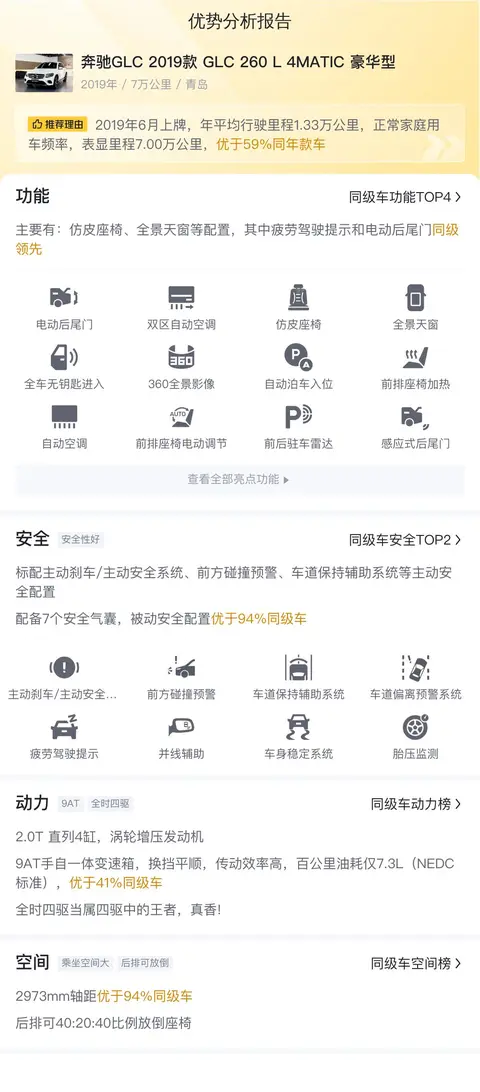 综上所述,奔驰GLC 2019款 GLC 260 L 4MATIC 豪华型在配置和性能方面表现出色,尤其是它的动力系统和安全配置,都处于同级领先水平。唯一可能让人犹豫的就是价格和使用成本,如果预算充足,这款车绝对是个不错的选择。但是也要考虑到奔驰异响问题,建议在看车的时候多留意这几点。