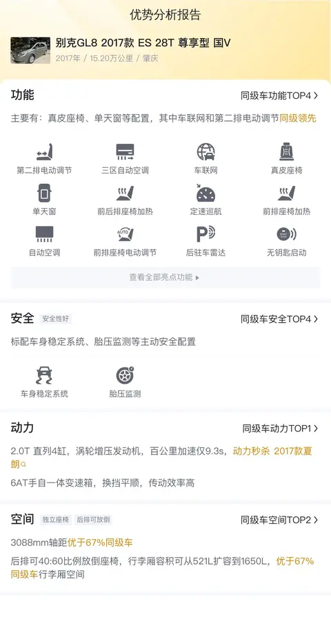 优势:作为早期MPV的代表,别克GL8的知名度尚可,保值率有一定保障。空间大,适合全家出行。MPV可以很好的适用全家出行,空间大,座椅多,比较受家庭用车欢迎。配置丰富,舒适性高。报价低于市场行情,价格优惠。