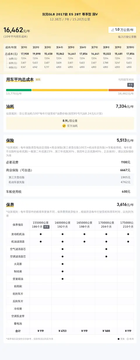 缺点:15万公里的里程值,确实偏高了,而且别克GL8的油耗也不低,养车成本高。商用过度,导致价值折扣,同时舒适度也不是绝对的理想,会有点硬。商务车的弊端也很明显,就是家用其实不怎么合适,买这类车的一般都是公司,家用需要好好考虑。