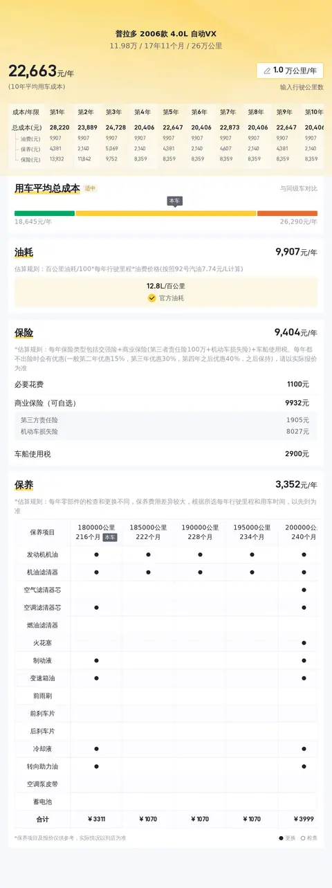 据估算,普拉多 2006款 4.0L 自动VX的用车成本较高,因为它的用车成本是22688元/年,同级车最低用车成本是16940元/年,最高用车成本是23742元/年。
