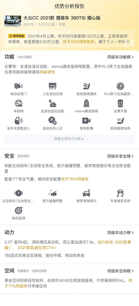 买二手车,配置要实用。大众CC 2021款 猎装车 380TSI 猎心版配备了全车无钥匙进入和启动、定速巡航、倒车影像、真皮座椅、前排座椅通风加热和记忆调整等配置。安全配置上,标配疲劳驾驶提示、车身稳定系统、胎压监测等主动安全配置,配备6个安全气囊,被动安全配置优于70%同级车。
