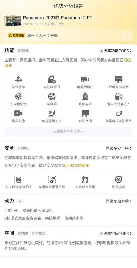 优势:品牌好,保时捷声名在外,而且外观流线型很好,看起来就很高级,驾驶感也不错,舒适度也值得夸赞,座椅既软又有支撑力,坐上去非常舒服。而且它的底盘也很稳,即使在高速行驶的时候也不会有颠簸的感觉。其次就是这一款Panamera 2021款 Panamera 2.9T的马力很足,驾驶感很棒。