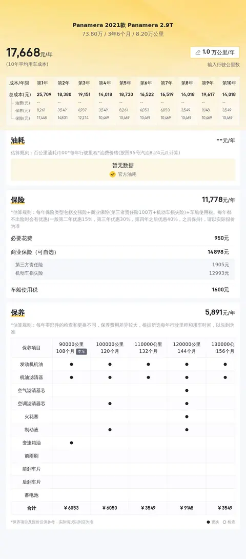 据估算,Panamera 2021款 Panamera 2.9T的用车成本是21798元/年,原价百万级别的车,这样的花费算得上是正常水准。