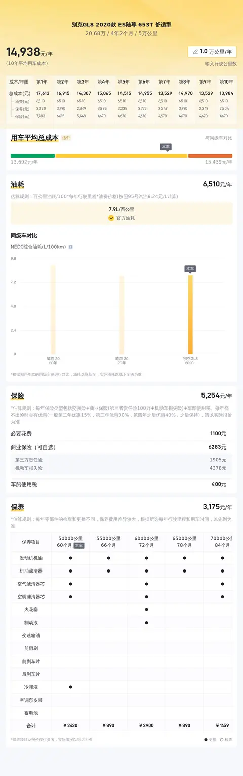 据估算,别克GL8 2020款 ES陆尊 653T 舒适型的用车成本也低,因为同级车的最低用车成本是14989元/年,最高是17708元/年,别克GL8 2020款 ES陆尊 653T 舒适型是15330元/年,所以较低。