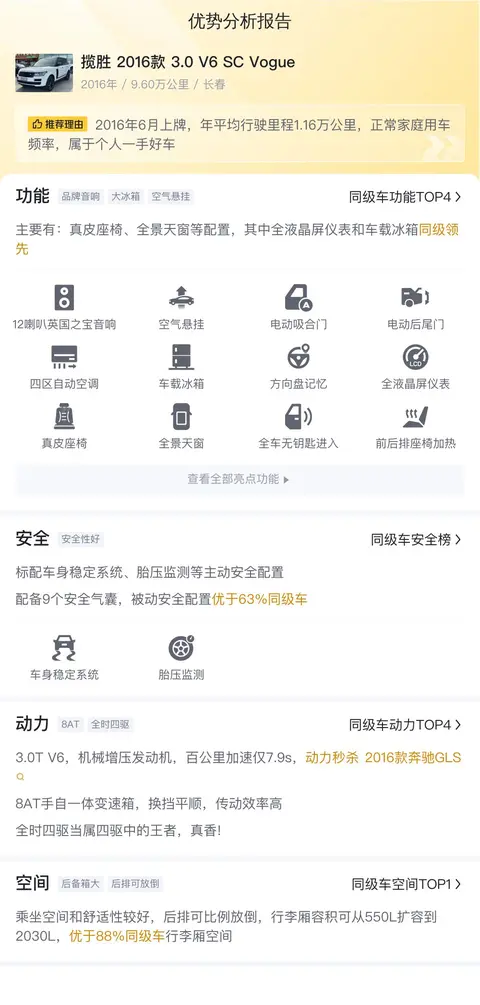综上所述的新车含税价、用车成本、市场行情、优势分析、同款比价等数据仅供参考。在配置部分,因为二手车非标品,车辆可能会存在配置改装的情况,具体车况信息需要线下结合车辆实际情况进行综合参考。