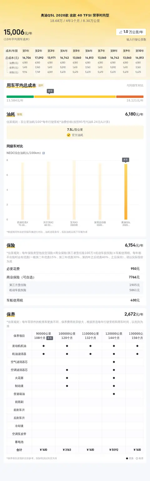 养车成本方面,该车官方公布的百公里油耗为7.5升,按每年行驶一万公里里程计算,燃油费用约为6472元,年度商业保险约5668元,每年保养费用约2648元,平均年度用车总成本约14788元,养车成本处于同类型车中等水平。上述数据仅供参考,实际用车成本因用车场景及行驶里程而有所不同。