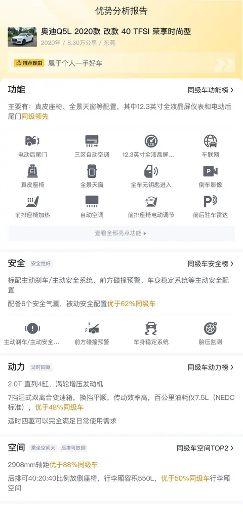 总结来说,这款奥迪Q5L 2020款改款 40 TFSI 荣享时尚型在车况、性能、配置及口碑等方面,均表现优秀,是一款值得推荐的二手车。如果您正好在寻找一款豪华SUV,那么不妨来了解一下它。