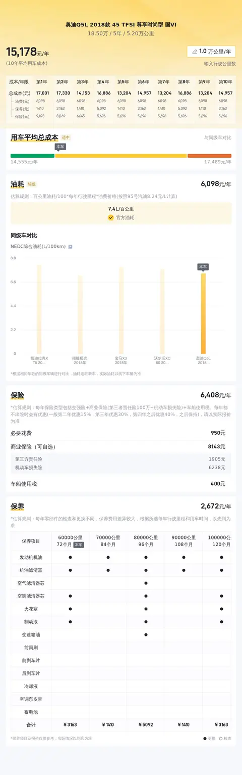 年度用车成本方面,这辆奥迪Q5L 2018款 45 TFSI 尊享时尚型 国VI的预估费用为15051元,其中包括油费、保养费等常规支出。实际费用可能根据您的驾驶习惯、用车频率及地区生活成本等因素有所浮动。在购买二手车时,请务必预留足够的资金用于日常运行及维护保养,以确保您能够持续享受无忧的驾驶体验。