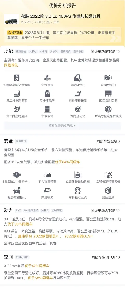 综上所述的新车含税价、用车成本、市场行情、优势分析、同款比价等数据仅供参考。在配置部分,因为二手车非标品,车辆可能会存在配置改装的情况,具体车况信息需要线下结合车辆实际情况进行综合参考。