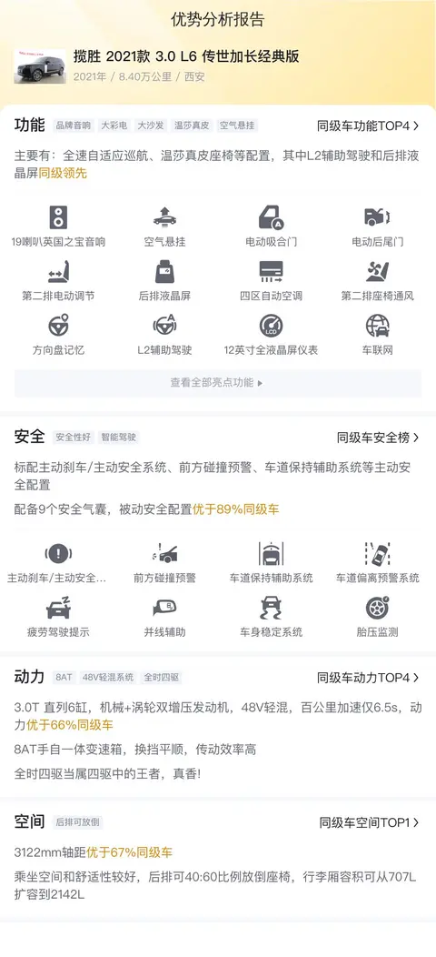 综上所述的新车含税价、用车成本、市场行情、优势分析、同款比价等数据仅供参考。在配置部分,因为二手车非标品,车辆可能会存在配置改装的情况,具体车况信息需要线下结合车辆实际情况进行综合参考。