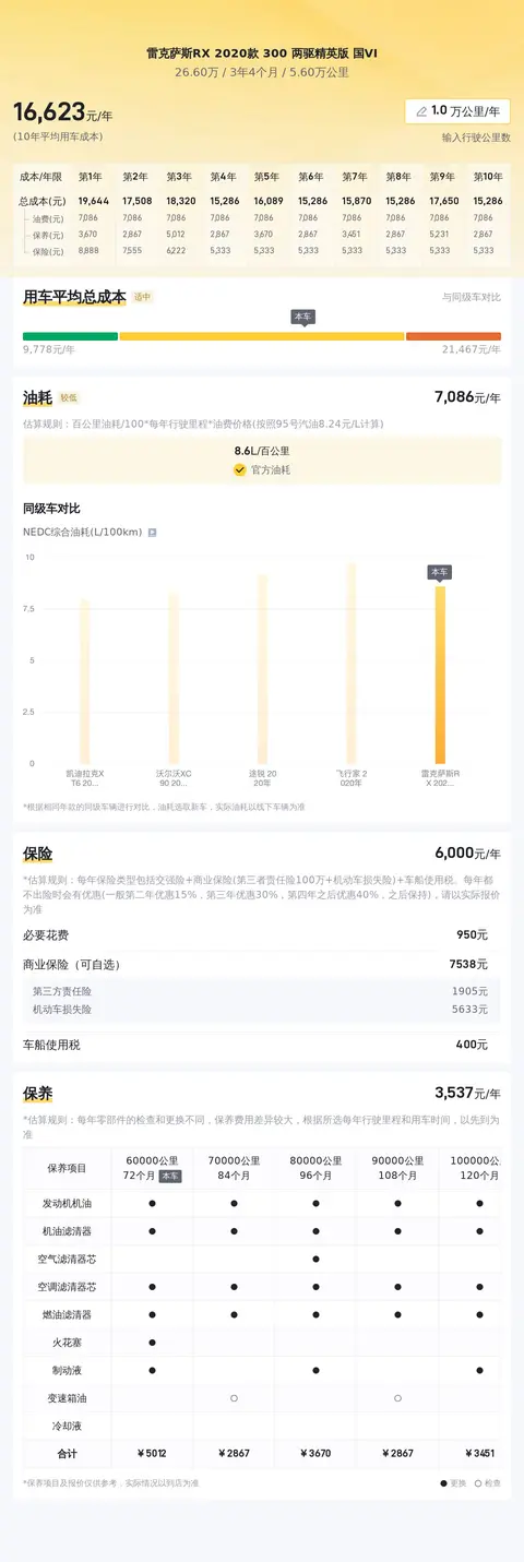 雷克萨斯RX 2020款300两驱精英版国VI是一款集豪华、性能与实用于一身的中大型SUV。作为雷克萨斯RX系列的重要成员,这款车型在动力系统、驾驶辅助以及舒适配置等方面均表现出色,为驾驶者和乘客带来了卓越的驾乘体验。首先,动力方面,这款雷克萨斯RX搭载了一台2.0T涡轮增压发动机,能爆发出231马力的最大功率和350牛·米的峰值扭矩。这样的动力配置确保了车辆在日常驾驶中能够提供充沛的动力输出,无论是城市穿梭还是高速巡航,都能轻松应对。更重要的是,其国VI排放标准的采用,展现了雷克萨斯在追求高性能的同时,也不忘环境保护的责任感,让每一次加速都更加“绿色”。在驾驶辅助技术方面,RX同样不遗余力。它配备了多项先进的驾驶辅助系统,如预碰撞安全系统、车道偏离预警等,这些技术能在关键时刻为驾驶者提供有效的帮助,提升行车安全性。同时,车辆还搭载了适应式巡航控制等智能驾驶辅助功能,让长途驾驶变得更加轻松惬意。舒适配置同样是这款RX的强项。豪华的内饰用料、宽敞的乘坐空间以及丰富的舒适性配置,如加热座椅、多功能方向盘等,都为乘客营造了一个既温馨又高级的乘坐环境。无论是长途旅行还是日常通勤,都能让乘客感受到来自雷克萨斯的尊贵礼遇。总的来说,雷克萨斯RX 2020款300两驱精英版国VI是一款能够满足驾驶者对动力、安全和舒适多重需求的优质车型。其合理的价格区间使得它成为了市场上极具竞争力的选择之一。如果您正在寻找一辆性能出色、品质可靠且价格适中的中大型SUV,那么这辆行驶了5.6万公里的雷克萨斯RX无疑是一个值得考虑的选项。