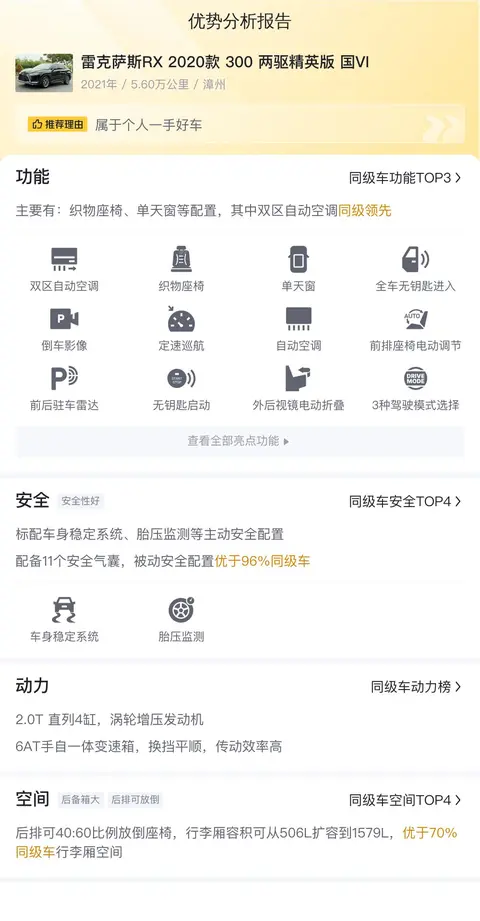 综上所述的新车含税价、用车成本、市场行情、优势分析、同款比价等数据仅供参考。在配置部分,因为二手车非标品,车辆可能会存在配置改装的情况,具体车况信息需要线下结合车辆实际情况进行综合参考。