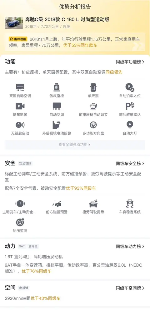 据估算,同级车的最低用车成本是11506元/年,最高是16310元/年,奔驰C级 2018款 C 180 L 时尚型运动版是13655元/年,整体适中。