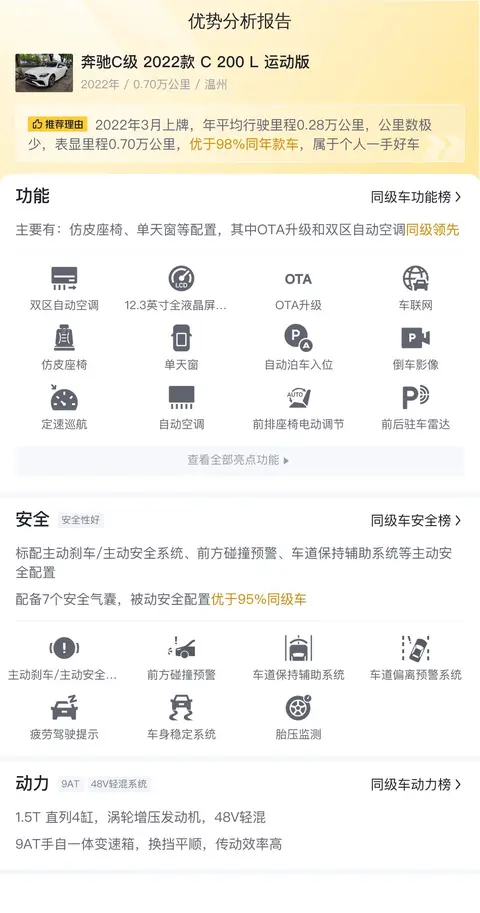 奔驰C级(图片|配置|询价)虽然是奔驰轿车入门款,但他的样子跟整体的操控安全系数并不低。比他便宜的奔驰还是有几款,例如A系,B系,CLA,GLA,EQA,EQB,不过以上都是SUV车型,并不是轿车,在一众奔驰轿车里,C系算是入门款式,所以价格相对实惠,也是大家进入奔驰轿车世界的敲门砖。今天要说的这款奔驰C级 2022款 C 200 L 运动版为2022年3月上牌,总行驶里程只有0.7万公里,个人一手车,绝对的准新车!更难能可贵的是经过检测,完全没问题,妥妥的三非车,也就是非重大事故、非火烧、非水泡。二手车市场上这样的车真的是车况相当好了,价格也合适,23.98万就能买辆近两万公里的奔驰C级,还是很合适的。