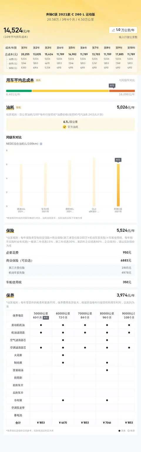 据估算,同级车的最低用车成本是11445元/年,最高是15950元/年,奔驰C级 2021款 C 260 L 运动版是14655元/年,用车成本不算低。
