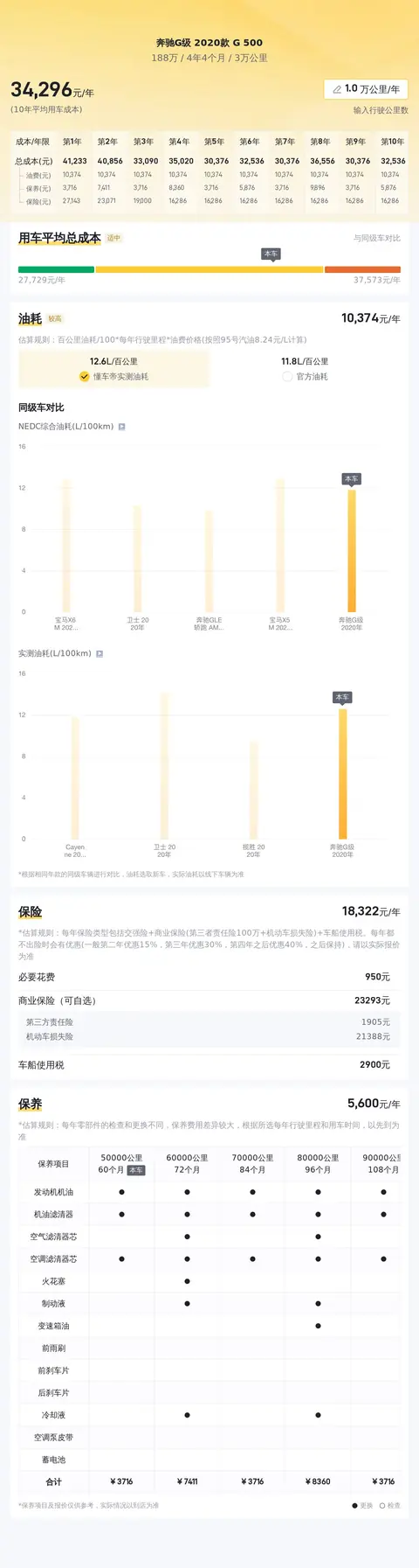 接下来是用车成本。根据懂车帝的大数据分析,这款车的10年平均用车成本大约在34288元/年。这个数字相较于同级别的车型来说,可以说是一个正常的水平。其中,油耗是大家比较关心的点,这款车的油耗大约在11.8L/百公里,对于一台V8的发动机来说,这样的油耗水平可以说是相当合理了。保险费用方面,预估每年11755元,这也是一个比较合理的费用。此外,保养费用也是用车成本中不可忽视的一部分,这款车的保养费用大约为1000元/年,相较于其他车型来说,这个费用可以说是较低的。总的来说,这款车的用车成本属于正常范围之内,对于追求豪华舒适、性能卓越的消费者来说,这样的成本投入是值得的。