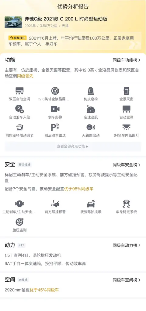 总的来说,这辆奔驰C级2021款C200L时尚型运动版二手车是一款集豪华、舒适、科技于一体的优质车型。它拥有豪华舒适的内饰、出色的动力性能和先进的智能互联科技,为驾驶者和乘客带来了卓越的驾乘体验。同时,其合理的售价和较低的里程数也使其成为了一款性价比极高的二手车选择。无论您是商务人士还是追求品质生活的消费者,这辆奔驰C级二手车都能满足您的需求,为您的出行带来更多的便利和享受。