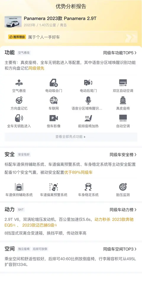 如果说看到很多二手车车源描述里提到的“美人鱼座椅”、“空气悬挂”、“四门无钥匙进入”以及“BOSE环绕音响”这些配置关键词,车迷朋友尤其是保时捷的粉丝一定是欲罢不能的,因为这些描述对应的车型就是保时捷Panamera(图片|配置|询价)!保时捷Panamera自2009年推出以来,一直是性能与豪华的代名词。独特的猎装车设计,兼顾了轿车的舒适性和跑车的动感。不断进化的动力系统和技术配置,使其在豪华四门跑车领域保持着领先地位。每一辆保时捷Panamera都是对工程精巧和艺术设计的致敬,它将继续演化,以满足未来市场的需求。今天要介绍的这辆Panamera 2023款 Panamera 2.9T,妥妥的新车,因为是2024年的新车上牌,目前只是开了1.4万公里,但是价格却比新车便宜了不少,现在只要96.8万。