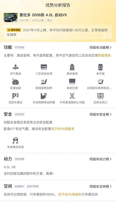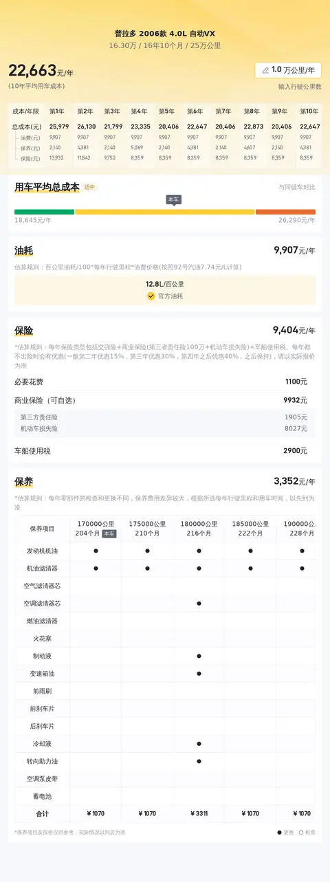 据估算,普拉多 2006款 4.0L 自动VX的用车成本是22774元/年,同级车最低是22774元/年,最高是31512元/年,所以它的用车成本偏低。