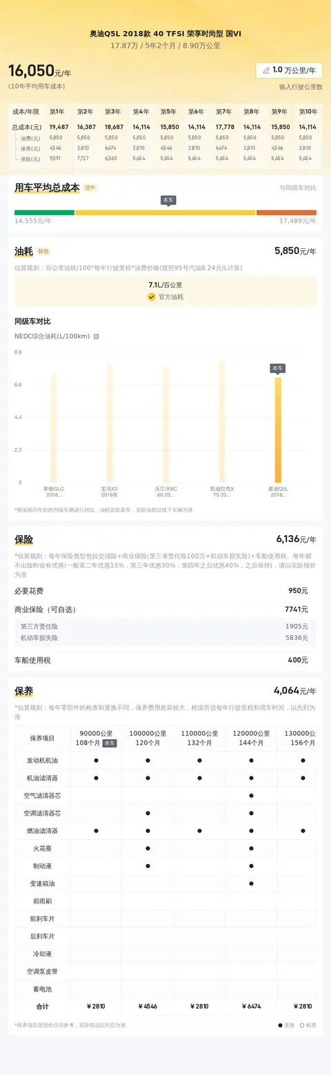 养车成本方面,奥迪Q5L 2018款 40 TFSI 荣享时尚型的百公里油耗为7.1L,按每年行驶一万公里里程计算,燃油费用约为6032元,年度商业保险约5725元,每年保养费用约4128元,日均养车成本约197元,作为一辆豪华中型SUV,养车成本适中。