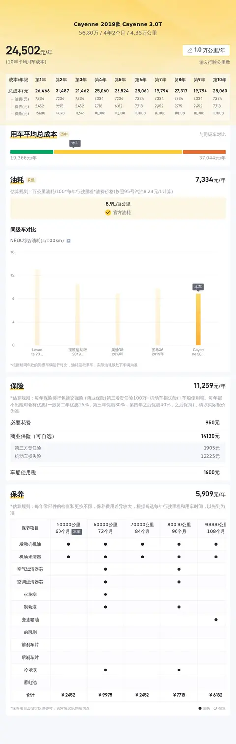 用车成本也是每个车主必须考虑的方面。根据估算,这辆Cayenne的年均综合用车成本约为2.5万元左右,但实际花费会依据车主具体的使用状况有所变化。