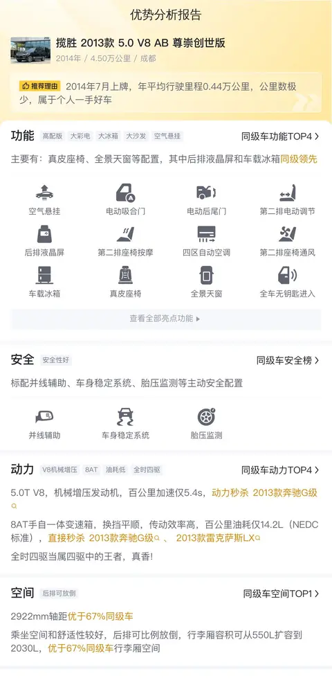 综上所述的新车含税价、用车成本、市场行情、优势分析、同款比价等数据仅供参考。在配置部分,因为二手车非标品,车辆可能会存在配置改装的情况,具体车况信息需要线下结合车辆实际情况进行综合参考。