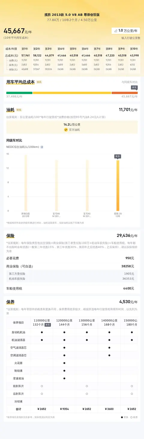 在用车成本方面,根据估算,这辆揽胜的年均综合用车成本约4.6万元左右,这项开销具体金额跟车主的用车场景和使用强度有直接关系。