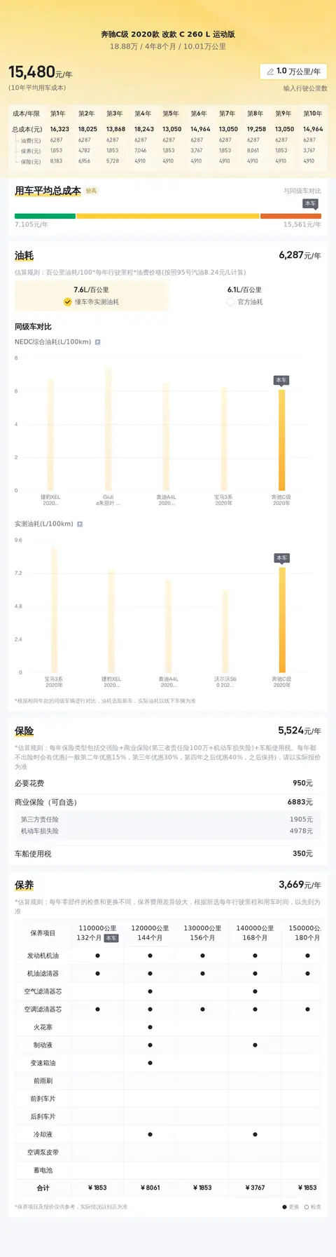 养车成本方面,这台车的官方百公里油耗为6.1升,按每年行驶一万公里里程计算,燃油费用约为5209元,年度商业保险约5688元,每年保养费用约4086元,平均年度用车总成本约14983元,养车成本处于同类型车中等偏上水平。上述数据仅供参考,实际用车成本因用车场景及行驶里程而有所不同。