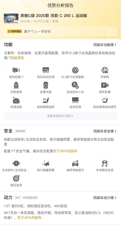 奔驰C级(图片|配置|询价)2020款改款C260L运动版是一款中型车,拥有4784mm的修长身姿,搭配1810mm的宽体和1457mm的挺拔高度,气场十足。1.5T的涡轮增压发动机搭配48V轻混系统,工信部综合油耗仅为6.1L/100km,真是“吃得少跑得快”!内饰方面,两块大屏展现科技魅力,金属质感按键与氛围灯更是点睛之笔。座椅舒适,支撑性佳,为每一次出行保驾护航。