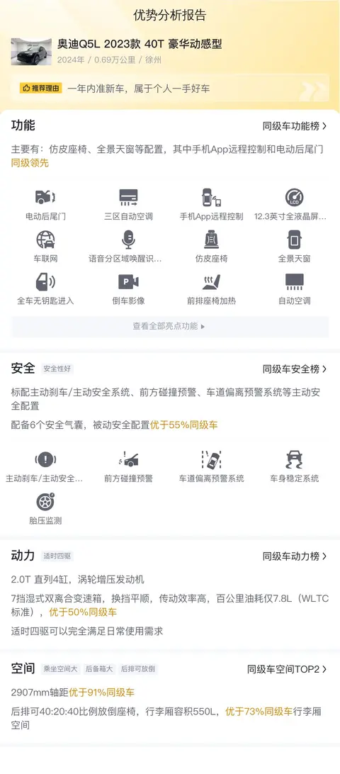 选购一款好车,既要看到它的优点,也要注意到它的劣势。正确地认知一款车型,有助于咱们在选购二手车的时候做到心里有数。接下来,咱们结合这款车的同级别车型综合分析一下这款奥迪Q5L 2023款 40T 豪华动感型二手车的具体表现如何。