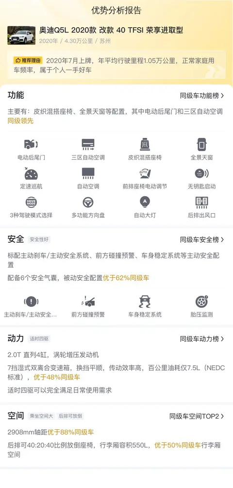 奥迪Q5L 2020款改款40 TFSI荣享进取型在配置、性能、安全和舒适性方面均表现出色,是一款集豪华与实用于一体的SUV。无论是在日常通勤还是长途旅行中,它都能为驾驶者和乘客提供卓越的驾乘体验。如果您正在寻找一款性能出色、配置丰富且具有较高性价比的豪华SUV,那么这辆二手奥迪Q5L 2020款改款40 TFSI荣享进取型将是一个不错的选择。