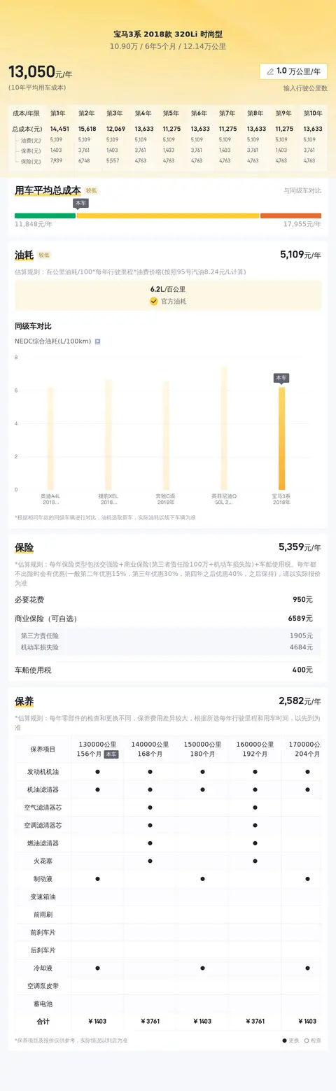 当前,宝马3系2018款320Li时尚型的二手车市场价格区间大约在12万至15万元。当然,具体的售价会受到车况、里程数和所在地等因素的影响。关于用车成本方面,按照每年2万公里的行驶里程计算,包括保险、燃油和保养在内的平均成本约为13,000元。需要注意的是,豪华品牌的维护和维修费用相对较高,这一点潜在车主在购买前应有所准备。