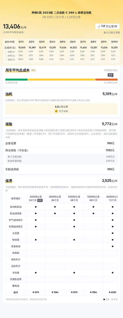 在考虑购买二手车时,除了购车成本外,还需要考量日常使用的费用。这款二手奔驰C级2023款二次改款C260L皓夜运动版,其百公里油耗约为6.4L,按照常规使用频率计算,每年的油费、保险费及保养费用等大约在1.4万元左右。这一数字仅供参考,实际花费可能会根据个人驾驶习惯、车辆维护状况等因素有所变动。在确保车辆性能与品质的同时,这款车型也致力于为车主提供合理的持有成本,让每一位拥有者都能享受到无忧无虑的驾驶生活。购买前建议您做详细的预算规划,以确保车辆的长期使用不会给您带来过大的经济压力。