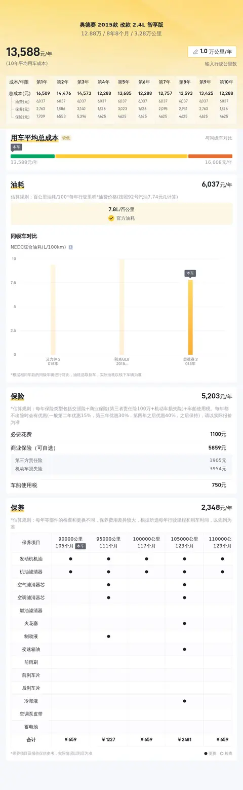 据估算,同级车的最低用车成本是13558元/年,最高是16346元/年,奥德赛 2015款 改款 2.4L 智享版是13558元/年,所以比较低。
