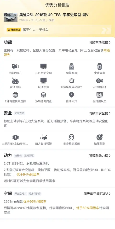 据估算,同级车的最低用车成本是6506元/年,最高是15773元/年,奥迪Q5L 2018款 40 TFSI 荣享进取型是15189元/年,用车成本较高。