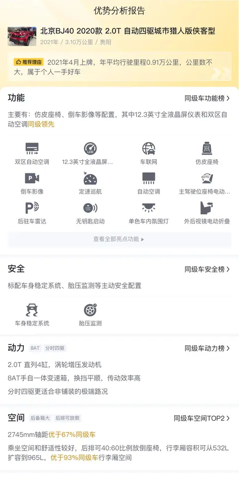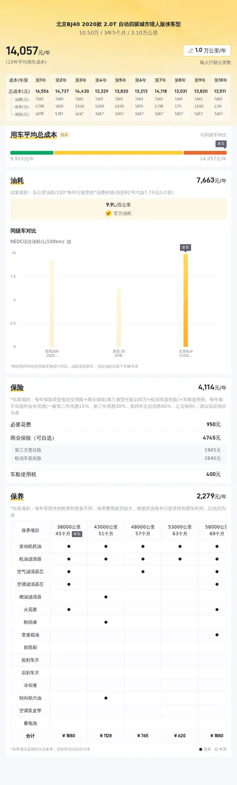 另外,同级车的最低10年平均用车成本是6507元/年,最高是16983元/年,北京BJ40 2020款 2.0T 自动四驱城市猎人版侠客型是13639元/年,用车成本不算低,但和同级车相比,也属于正常。