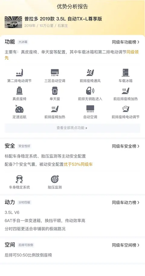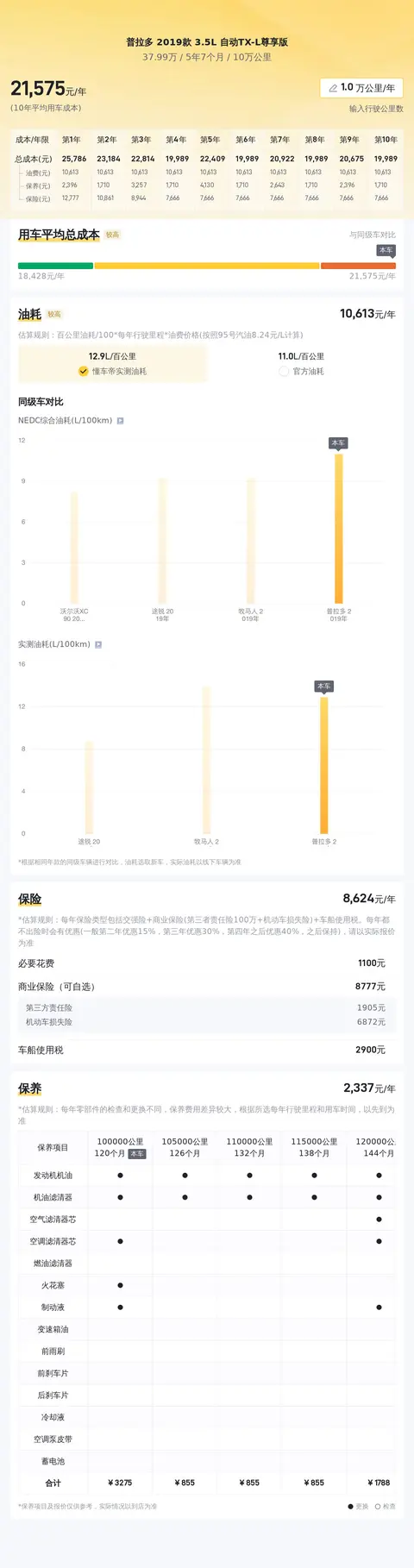 据估算,同级车的最低用车成本是14988元/年,最高是25764元/年,普拉多 2019款 3.5L 自动TX-L 尊享版是22063元/年,所以不算低。