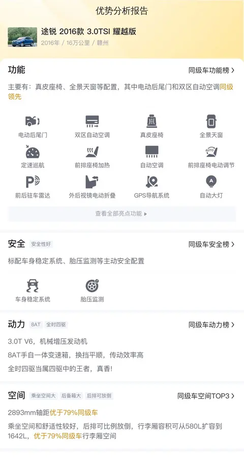 途锐 2016款 3.0TSI 耀越版拥有豪华内饰和强劲动力,适合追求高品质生活的消费者。车身尺寸较大,内部空间宽敞,适合家庭使用。同时,它的驾驶性能和越野能力也非常出色,可以应对各种路况。但是作为一款豪华车型,维护和保养成本较高。对于普通消费者来说,可能需要考虑经济实力和实际需求来决定是否购买。