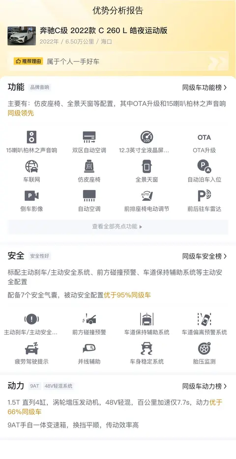 奔驰C级(图片|配置|询价)2022款C260L皓夜运动版是一款备受瞩目的豪华轿车,凭借其卓越的性能和优雅的设计,成为了众多消费者的心仪之选。这款车型在动力、操控、安全以及舒适性等方面均表现出色,不仅满足了日常出行的需求,更带来了非凡的驾驶体验。今天要介绍的这辆奔驰C级2022款C260L皓夜运动版,上牌地为海口,上牌日期2022年5月,表显里程6.5万公里,新车指导价36.92万,二手车报价24.98万,过户次数0次。