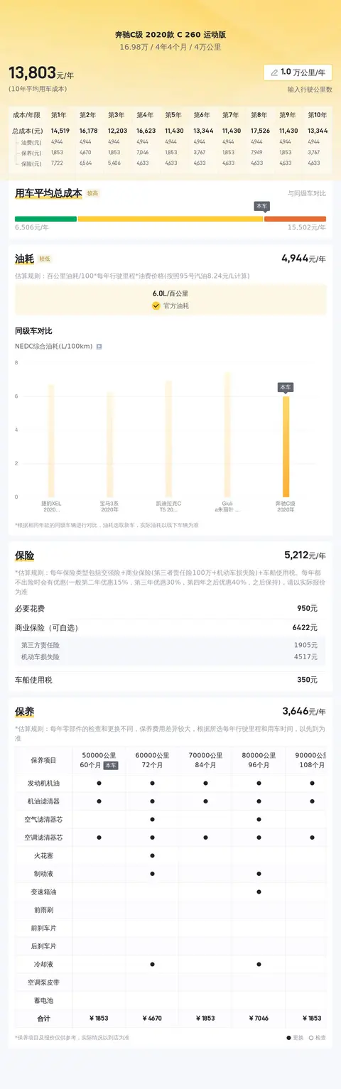 据估算,同级车的最低用车成本是6506元/年,最高是16883元/年,奔驰C级 2020款 C 260 运动版是13538元/年,用车成本较高。