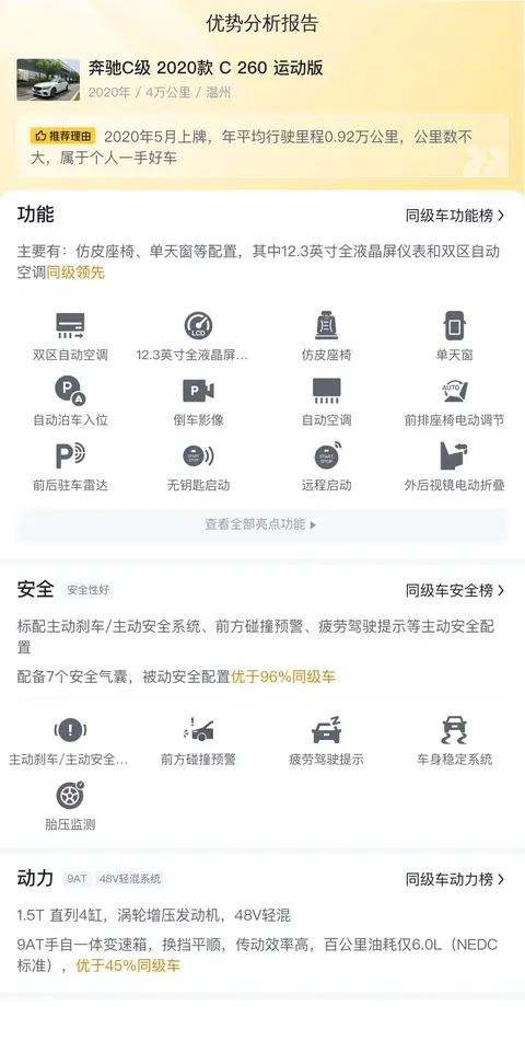 优点是作为豪华品牌,奔驰C级 2020款 C 260 运动版的知名度不错,保持率有一定保障。并且这一款的里程值不高,内饰保养的还不错。加上配置丰富,动力强悍,所以整体看来还是不错。