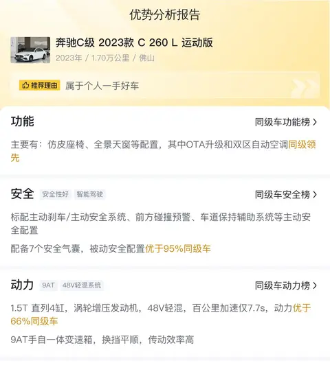 综上所述,这款奔驰C级 2022款 C 260 L 运动版在二手车市场中展现出极高的性价比和竞争力。它不仅拥有奔驰品牌的光环加持,更在性能、配置、安全等方面表现出色。这款车自购买以来仅行驶了1.7万公里,且未曾有过过户记录,显示出其良好的保养和使用状况。这款车的当前市场新车指导价为35.12万元,而我们所提供的二手车报价为27.38万元,这无疑为购车者提供了更为经济实惠的选择。这款车的10年平均用车成本约为14670元/年,与同级别车型相比,这一成本属于合理范围之内。在市场行情部分,根据大数据分析,这款车的二手车市场价格区间为21.91万-25.87万,而我们的报价为27.38万,虽然高于市场均价,但考虑到这款车的车况良好、配置丰富且行驶里程较短,这一价格仍具有一定的竞争力。此外,这款车的保值率较高,根据相关数据显示,其三年保值率预计可达51.22%,远高于同级别车型。在用车成本方面,这款车的10年平均用车成本约为14670元/年,与同级别车型相比,这一成本属于合理范围之内。总体而言,这款车是一款集豪华、性能与实用于一体的优质车型,值得广大消费者的高度关注和考虑。