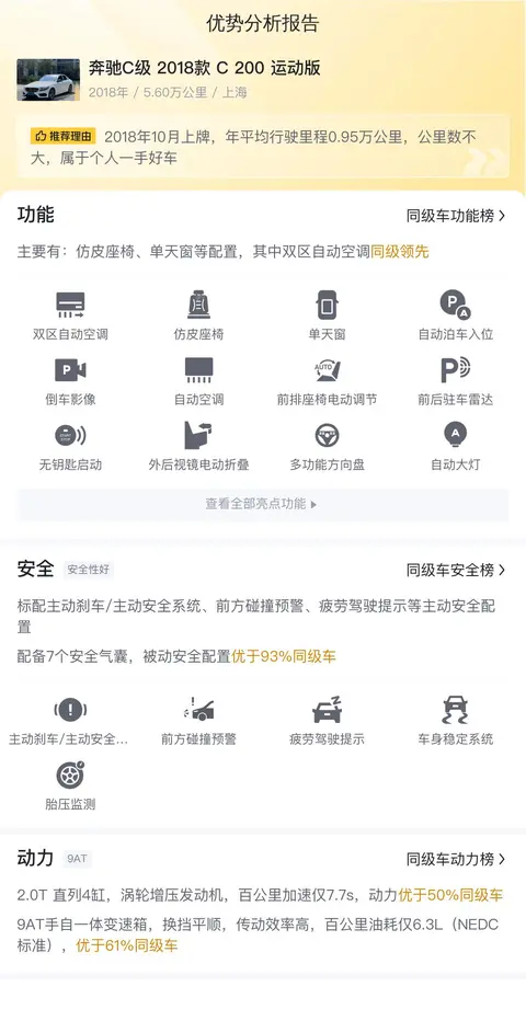 据估算,同级车的最低用车成本是11528元/年,最高是18178元/年,奔驰C级 2018款 C 200 运动版是13680元/年,用车成本适中。