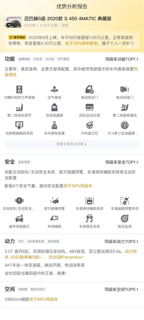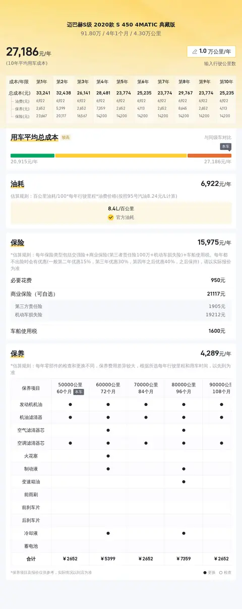 另外,同级车的最低10年平均用车成本是18593元/年,最高是46720元/年,而迈巴赫S级 2020款 S 450 4MATIC 典藏版是26649元/年,正常水准。