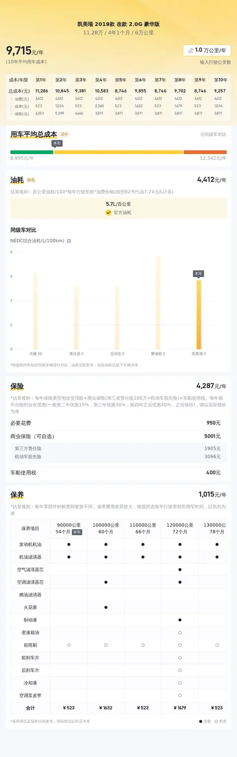 接下来,我们来聊聊大家最关心的价格问题。懂车帝对市场进行了大数据分析,目前这款二手凯美瑞 2019款 改款 2.0G 豪华版的售价在11.59万至14.19万之间。当然,具体价格还要看车况等因素而定。至于用车成本方面,这辆车的年均综合用车成本大约在每年1.0万元左右。需要注意的是,实际费用支出可能会因个人用车习惯及车况维护情况而有所不同。