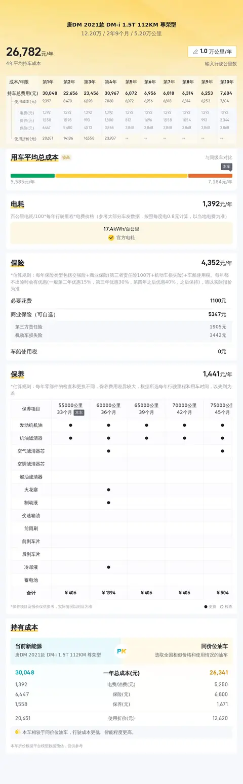 据估算,唐DM 2021款 DM-i 1.5T 112KM 尊荣型的用车成本较低,因为同级车的最低用车成本是5705元/年,最高是7766元/年,而唐DM 2021款 DM-i 1.5T 112KM 尊荣型是5989元/年,所以较低。