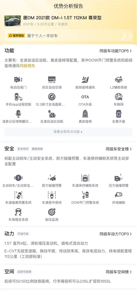 2021款的车,配置也挺丰富。唐DM 2021款 DM-i 1.5T 112KM 尊荣型配备了全速自适应巡航、真皮座椅等配置、DOW开门预警系统、前排座椅通风,其中的前排座椅通风,正适合现在这个季节使用,打开以后,坐到座椅上不会感觉到热乎乎的。