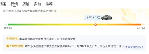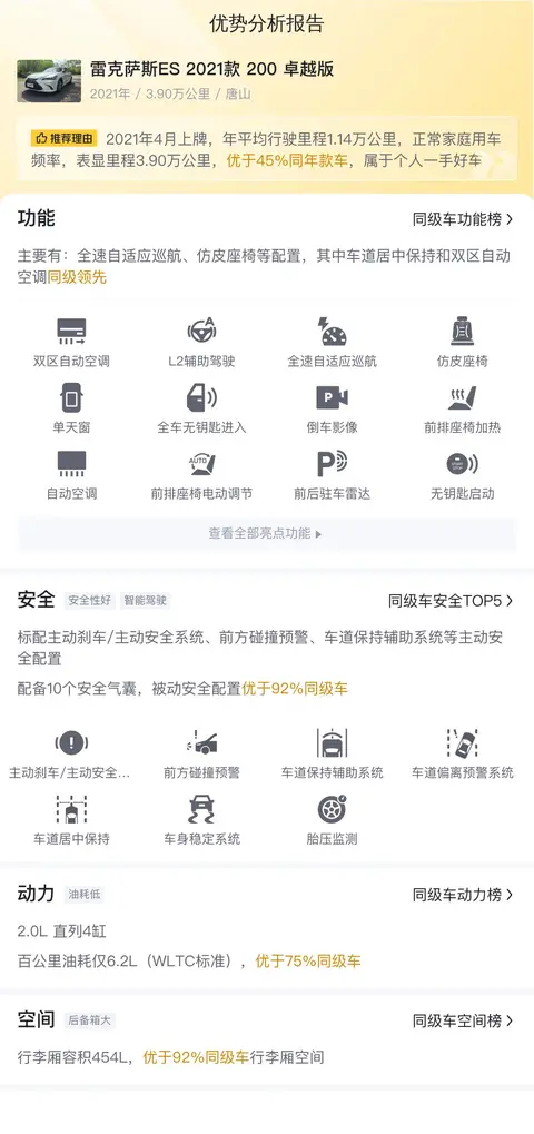 优势:雷克萨斯ES 2021款 200 卓越版的市场行情价是19.50万-23.71万,它的报价则是22.28万,这个价格也算有一定优势,同时保值率也高。加上本身的里程值比较少,整体的车况比较新,所以性价比还是不错的。