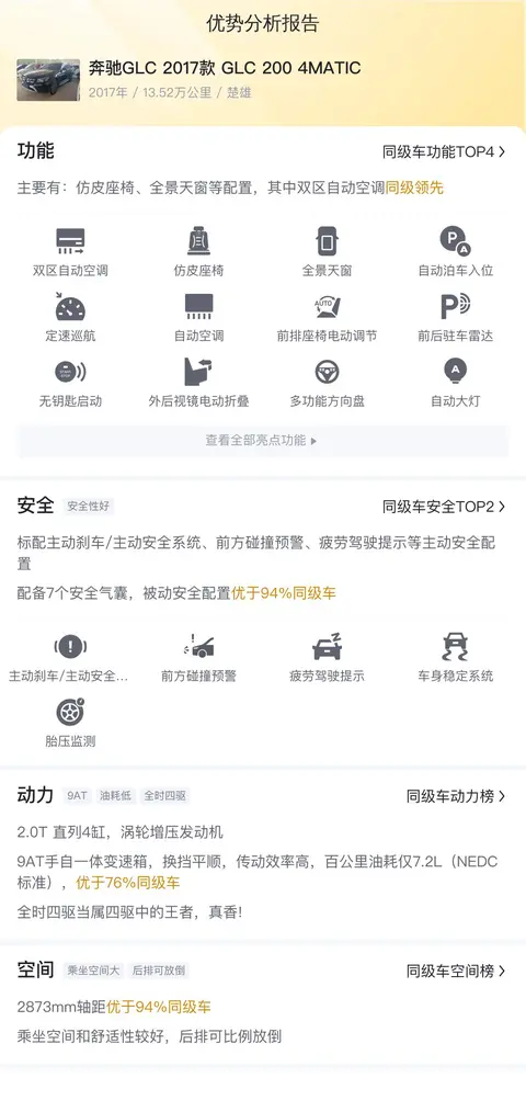 优势:奔驰GLC 2017款 GLC 200 4MATIC的市场行情价是17.22万-20.46万,报价18.80万,价格上有优势,同时保值率也高。配置上,双区自动空调、自动泊车入位等配置都有,还可以。