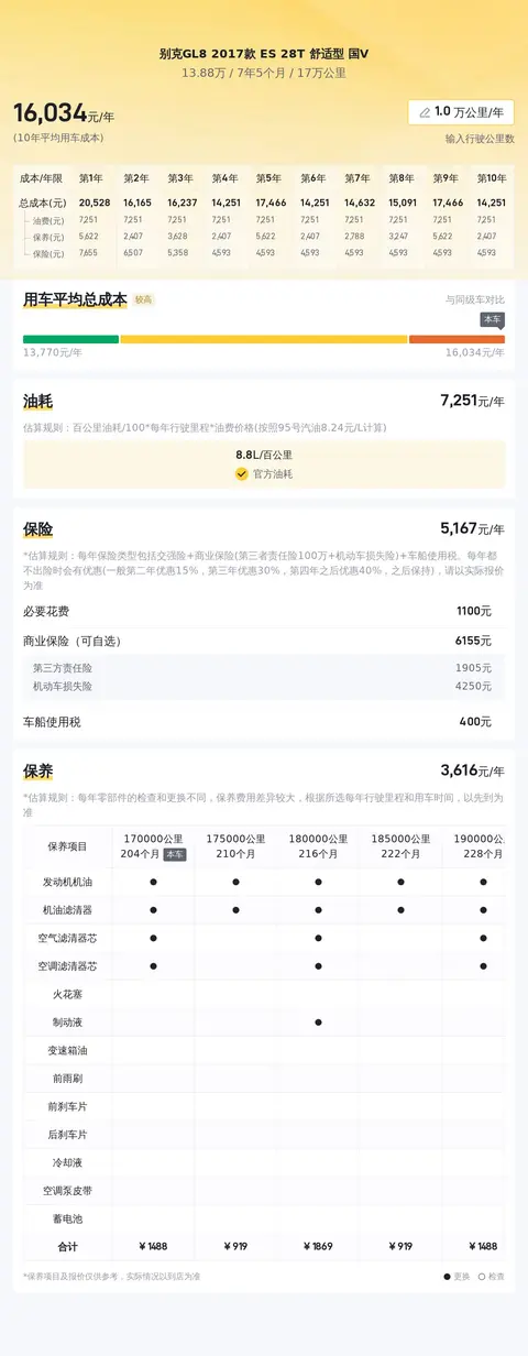 据估算,别克GL8 2017款 ES 28T 舒适型 国V的用车成本也高,因为同级车的最低用车成本是13158元/年,最高是16538元/年,别克GL8 2017款 ES 28T 舒适型 国V是16181元/年,所以偏高。